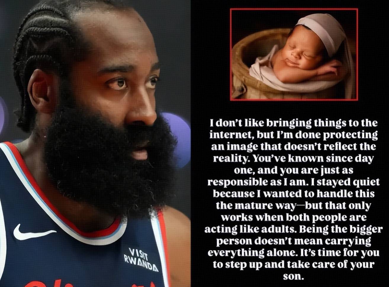 据悉,这位女士写道:“我不喜欢将事情公之于网络,但我再也不想维护一个与现实不符的形象了。从第一天起你(哈登)就已经知晓我有孩子了,你和我一样都负有责任,此前我一直保持沉默,是因为我希望能以成熟的方式处理此事,但现在我需要你也站出来、承担起照顾你儿子的责任。”